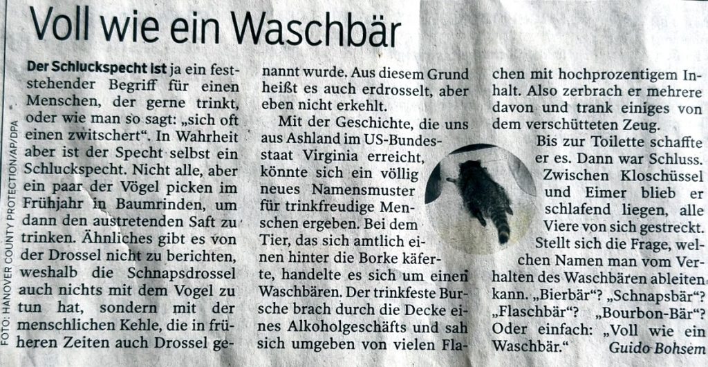 * Für die getrennte Erfassung der Bioabfälle wurde im Landkreis Göppingen der Biobeutel eingesetzt. Es handelt sich um einen blauen Kunststoffbeutel mit einem Volumen von 15 Litern. Dürfte der v.g. Aktion zuwiderlaufen. In Berlin würde eine solche „ungeschützte Futteraktion“ (wenn denn der Waschbär als Beweis herhalten könnte) evtl. bis zu 5.000 € Bußgeld kosten „Niedlich oder nervig? TVdirekt 21/2023. Anm.: Dem Biologen Berthold Langenhorst vom NABU Hessen zufolge gehören Waschbären zu den intelligentesten Tieren der Welt: „Sie können Gläser und Dosen aufdrehen, die Gefahr durch Menschen einschätzen und wissen, dass man Bier trinken kann, wenn man die offene Flasche umstößt.“ Siehe auch „Plage in BW“ JÄGER 1.10.25!