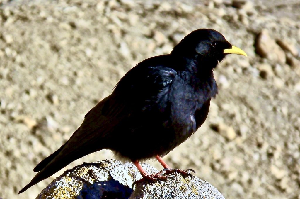 Die Alpendohle ist eine Vogelart aus der Familie der Rabenvögel Corvidae. Der 34 bis 38 cm große Vogel ist ein mittelgroßer Vertreter seiner Familie und zeichnet sich durch schwarzes Gefieder, rote Beine und einen gelben Schnabel aus. Im Feld ist die Art daneben auch durch ihren akrobatischen Segelflug und ihre pfeifenden Rufe zu erkennen. Ihr lückenhaftes Verbreitungsgebiet umfasst die Hochgebirge der südlichen Paläarktis, wo sie montane Höhenlagen mit freiliegenden Felsen bewohnt. Die Nahrung der Tiere besteht zum Großteil aus Beeren und Wirbellosen, bei Gelegenheit fressen sie aber auch kleine Wirbel-tiere, Vogeleier oder menschliche Abfälle. Alpendohlen leben sehr gesellig, sie bewegen sich in Schwärmen und brüten gelegentlich in Kolonien. Ihr Nest errichten sie zwischen April und Juni in Felsnischen. (Wikipedia, NABU).