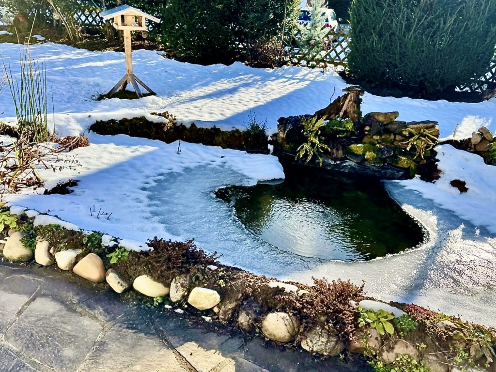 Eiszeit am Teich: Wenn sich die erste dünne Eisschicht auf der Wasser-oberfläche bildet und die noch vor wenigen Wochen so vielfältige Unter-wasserwelt vor unseren Augen verschwindet, ist es kaum vorstellbar, dass unsere Teichbewohner diese kalten Wochen überstehen. Und doch sind Frösche, Kröten, Molche, Fische, Wasserschnecken, Libellenlarven u.a. Kleintiere auf einmal alle wieder da, sobald die Temperaturen im Frühjahr wieder höher steigen. Aber wie schaffen sie es aus eigener Kraft, ganz ohne Heizung, wärmende Sonnenstrahlen und einer robusten Winterausrüstung zu Leberleben? Die Strategien sind je nach Tierart so spannend wie vielfältig. Für Fische ist Sauerstoffmangel die größte Gefahr, sobald die Wasseroberfläche zufriert. Liegt auf der Eisfläche dazu noch eine dicke Schicht Schnee, stagniert durch Lichtmangel auch die Sauerstoffproduktion der Wasserpflanzen. Wenn die Fische dicht unter der Eisschicht schwimmen, ist das ein Zeichen dafür, dass die Luft knapp wird. Jetzt gilt es zu handeln. Doch Vorsicht: Mit einem Hammer ein Loch in das Eis zu schlagen, ist nicht die richtige Methode. Durch die Druck-wellen könnte in kleinen Teichen die Schwimmblase der Fische Schaden nehmen. Ratsamer ist es, mit einem Topf heißen Wasser ein Loch in die Eisdecke zu schmelzen (auch ein auf der Oberfläche schwimmender Ball hält diese stellenweise offen) oder einen Eisfreihalter zu verwenden. Noch besser ist es, den Teich mindestens 100 – 120 cm tief anzulegen, denn dort kühlt das Wasser nicht unter 4 °C ab.