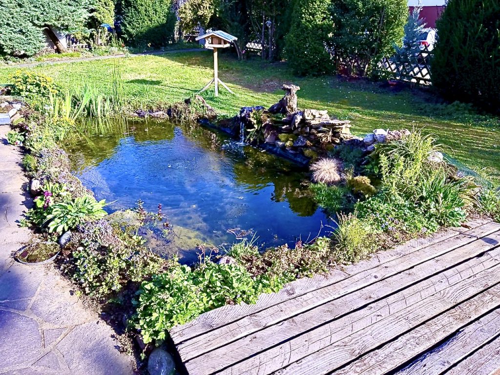 - Der Platz: Idealerweise sollte der Teich eben und nicht direkt unter einem Baum liegen. Laub fördert übermäßigen Algenwachstum. Auch pralle Sonne sollte man vermeiden, da sie Algenbildung begünstigt. Anm.: Ein mit Holzbalken überdachter Bereich über der Tiefenzone könnte einen „Kälte-pool“ bilden und gibt einen guten Beobachtungspunkt ab.
