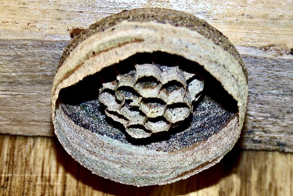 Ein Wunderwerk der Natur – Sechseckige Waben: Bei Wespen und Hornissen sind die Wabenzellen nur Kinderzimmer, Honigbienen verwenden diese auch als Vorratskammern für Honig und Blütenpollen. Gemeinsam ist nur die sechseckige Struktur, die geometrisch eine ideale Raumaufteilung darstellt. Auch der Mensch nutzt dies oft für stabilisierende und trotzdem leichte Strukturen (Bionik). Während Wespen und Hornissen das Baumaterial (abgeraspeltes Holz) in der Umgebung sammeln müssen – wie übrigens auch Vögel für ihre Nester – bauen Honigbienen die Waben aus selbst hergestelltem Wachs. Damit sind sie in der Lage, ihre „Wohnung“ mit selbst ausgeschwitztem Material herzustellen: Als 0,8 Milligramm schwere Plättchen entsteht das zunächst weiße Wachs aus Drüsen zwischen den Hinterleibs-Ringen. Zu seiner Erzeugung benötigen die Bienen sehr viel Energie. Dies zeigt sich auch bei der Verwendung als Kerzenwachs, das bei der Verbrennung diese Energie wieder freisetzt. Für 100 Gramm Wachs benötigen sie mehrere Liter gesammelten Blütennektar.