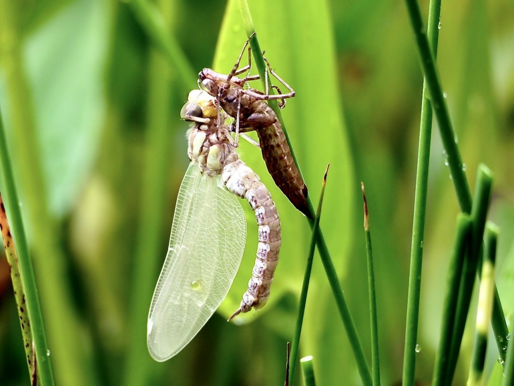 Bei länger anhaltendem Regenwetter kann sich eine Pfütze aber auch über Wochen halten, wenn sie immer wieder aufgefüllt wird. Pfützen sind wichtiger, als du vielleicht denken würdest. Sie stellen die kleinste Form eines Gewässers dar, sind ein Lebensraum für Amphibien und eine wichtige Brutstätte für Insekten. Etwa Libellen (ff. Fotos: Blaugrüne Mosaikjungfer Aeshna cyanea – Gartenteich Schlat; Blauflügel-Prachtlibelle Calopterix virgo – NABU-Gut Sunder/Niedersachsen) oder Stechmücken legen ihre Eier dort ab. Die Larven entwickeln sich größtenteils im Wasser.