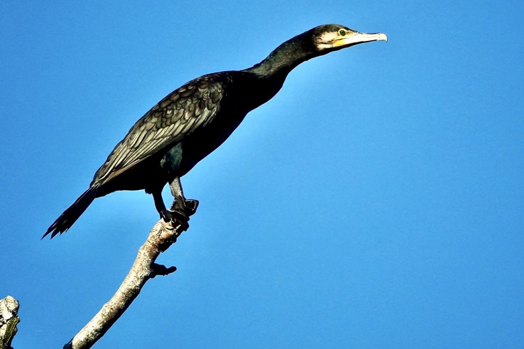 Kormoran: Dieser überwiegend dunkel gefärbte Vogel lebt in der Nähe großer Gewässer. Seine Hauptnahrungsquelle sind Fische. Er brütet in Kolonien auf Felsklippen oder im Binnenland auf Bäumen. Dort verätzt der Kot häufig die Blätter, weshalb Bäume, auf denen Kormorankolonien brüten, oftmals kahl sind. Nachdem sein Vorkommen gerade in der ersten Hälfte des letzten Jahrhunderts aufgrund massiver Verfolgung extrem zurückging, haben sich seine Populationen mittlerweile erholt. (Auszug NABU-Vogelprorträts)