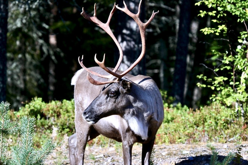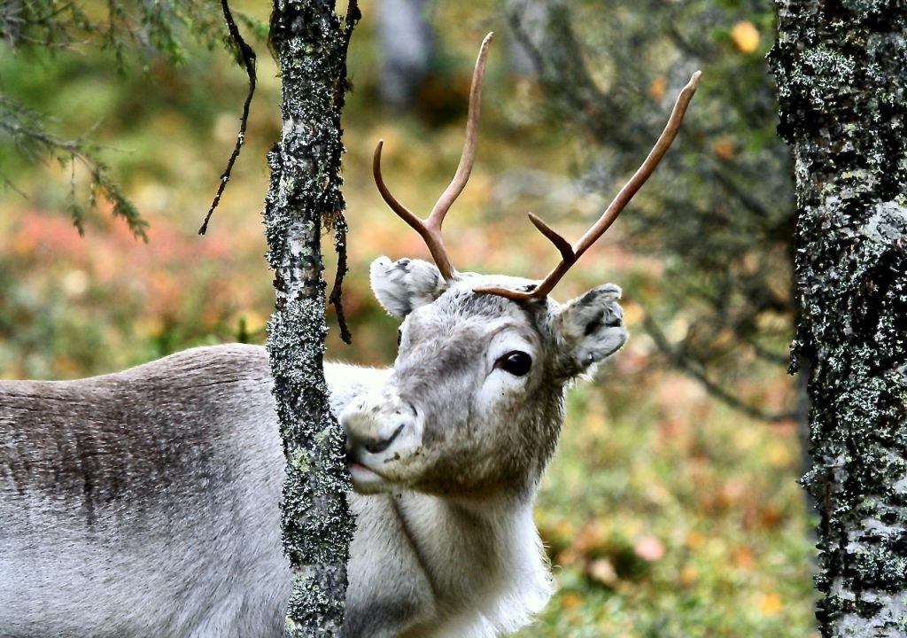 Rentiere Rangifer tarundus (F: Mallan luonnonpuisto/Strict Nature Reserve/Lappland – Grenzregion Finnland – Norwegen) leben im Sommer in den Tundren und im Winter in der Taiga Nordeurasiens und Nordamerikas und sind die einzige Hirschart, die vom Menschen gehalten wird. Die traditionelle Lebensweise vieler indigener Völker des eurasischen Nordens ist durch das Zusammenleben mit Rentieren geprägt. Als einzige Hirschart trägt hier auch das ♀ ein kleines Geweih.