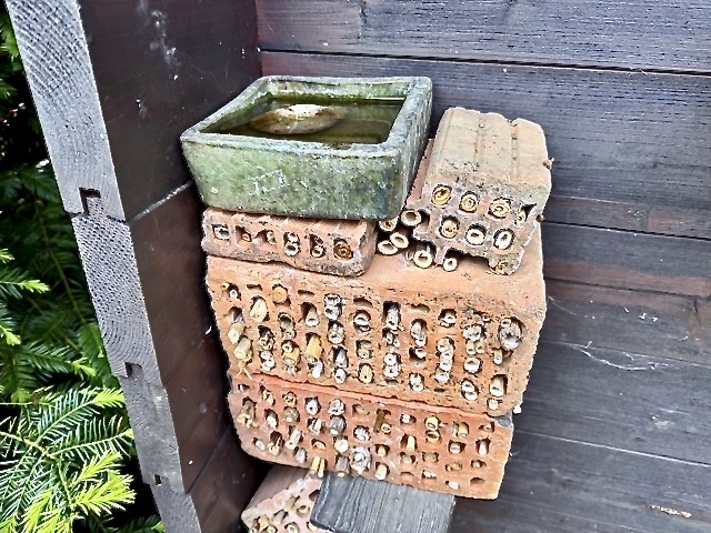 Die Hautflügler unter den Insekten, wie z.B. Bienen und Faltenwespen, gingen in den letzten Jahren besonders alarmierend („Krefelder Studie„) zurück, u.a. auch durch Mangel an geeigneten Nistplätzen. Dabei kann den bedrängten Insekten oft mit einfachsten Mitteln geholfen werden. Die meisten Hautflügler, die in Holz nisten, bohren ihre Gänge nicht selbst, sondern beziehen bereits vorhandene Bohrgänge, etwa von Käfern. Hier setzt unsere Hilfe an: Bohrlöcher von 2 – 10 mm Durchmesser und im aufgehängten Zustand leicht ansteigender, unterschiedlicher Länge in einem Holzblock (z.B. Buchen- oder Eichenholz – nicht mit Konservierungsmitteln behandelt) bieten Insekten künstliche Brut-stätten. Insekten nehmen auch gerne Lochziegelsteine an, wenn sie an einem sonnigen Platz so aufgestellt werden, dass die Löcher waagerecht zu liegen kommen und nicht gegen die Wetterseite weisen. Auch im Winter bleiben die Insekten-Nisthilfen draußen. (Quelle: Info-Tafel imNaturgarten in der Kloster-villa Adelberg).